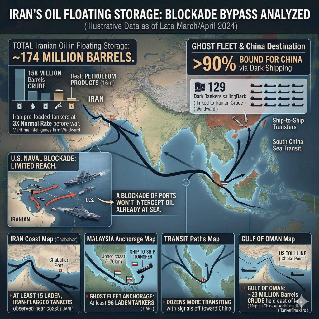 請仔細研究下面的資訊圖。你知道嗎?在戰爭開始之前,伊朗曾以正常速度的三倍,瘋狂地將油輪裝滿石油,並運往遠東,最終目的地是中國。中國購買了伊朗90%的石油,許多被稱為「茶壺」煉油廠的民營企業都依賴伊朗的原油。